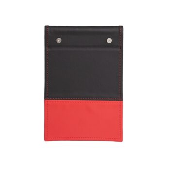 Bloco de anotações em couro sintético com porta caneta. Possui aproximadamente 100 folha brancas sem pauta.
