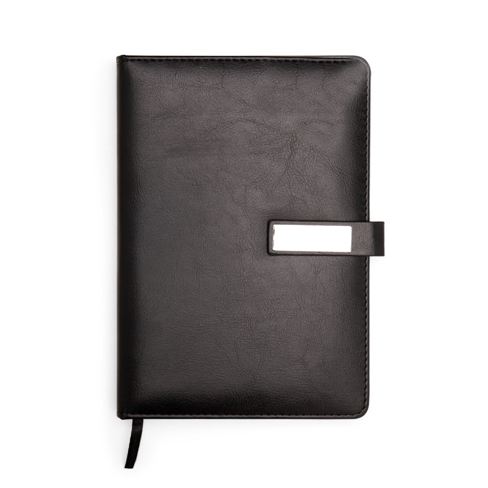 Caderneta com capa em couro sintético, fecho magnético, além de marca-páginas em fita de cetim. Possui aproximadamente 96 folhas marfim com pauta. Acompanha plaquinha fixa em metal.