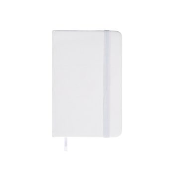 Caderneta emborrachada com marcador de página em cetim e fita elástica para fechar. Contém aproximadamente 80 folhas amareladas com pauta.