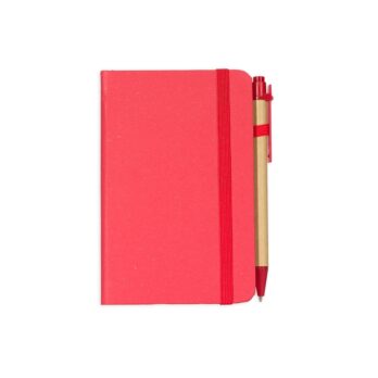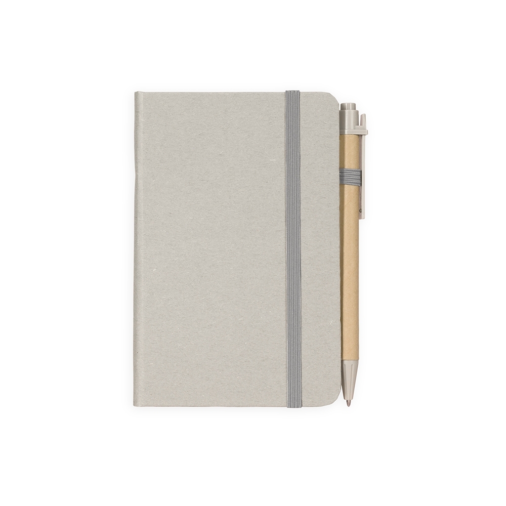 Caderneta ecológica de capa dura revestida em fibra de palha de trigo. Contém aproximadamente 80 folhas brancas com pauta, além de duas folhas de guarda, uma fita para fechamento e porta-canetas elástico. Acompanha uma caneta esferográfica de carga azul de 1,0mm com corpo em papelão e clip, acionamento por clique e ponteira em plástico.