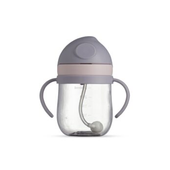 Copo de transição infantil feito em plástico com capacidade de 350ml. Com pegador duplo, tampa de proteção e canudo de silicone, o copo possui um sistema de válvula antivazamento e antisufocamento.
