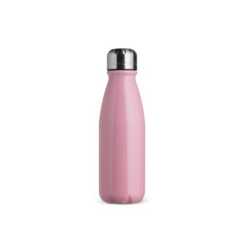 Garrafa em alumínio com tampa rosqueável e capacidade para até 550ml.