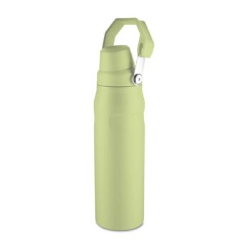 Garrafa térmica de 750 ml com parede dupla em inox (interno 304 / externo 201), pintura a pó e tampa em plástico PP. A tampa é removível e pode ser encaixada na alça.