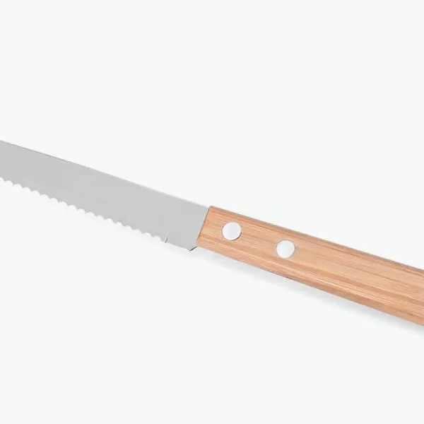 Conjunto para bar em Bambu/Inox contendo faca de 7″ em Bambu/Inox; colher de 18 cm, pilão, pegador e tábua em Bambu. Acompanha também faca para frutas 4″ em Madeira/Inox.