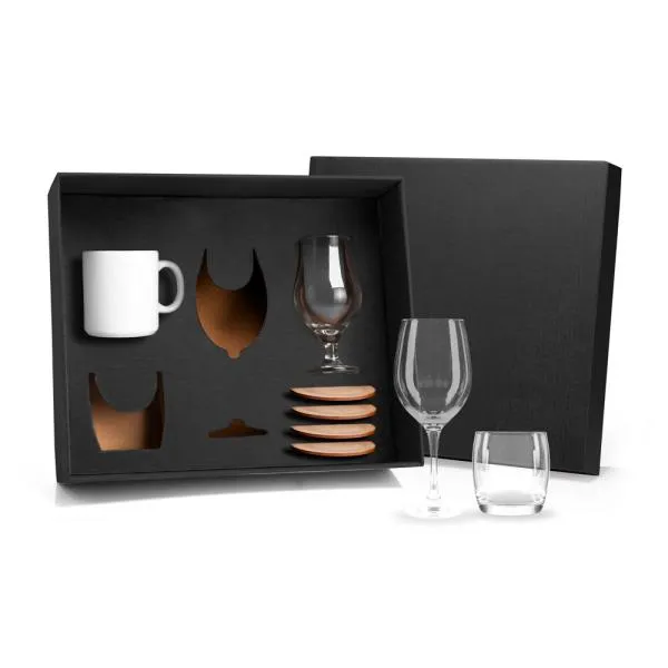 Gravação: Uma gravação a Laser na petisqueira e nos copos; uma gravação em Silk/Digital na tampa da caixa.