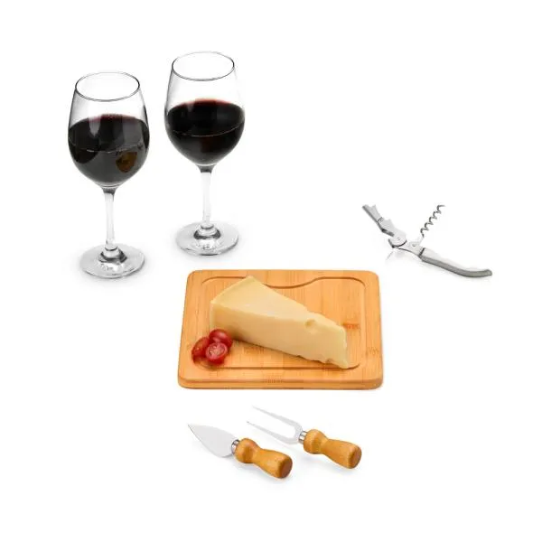 Composto por tábua em Bambu quadrada; faca e garfo em Madeira/Inox; duas taças em vidro para Vinho e abridor saca-rolhas em aço Inox escovado.