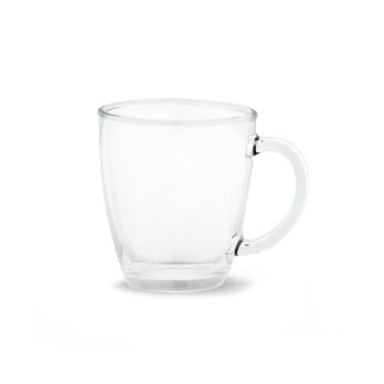 Caneca em vidro. Capacidade até 390 mL. Fornecida em caixa presente. Certificação EU Food Grade. ø91 x 103 mm