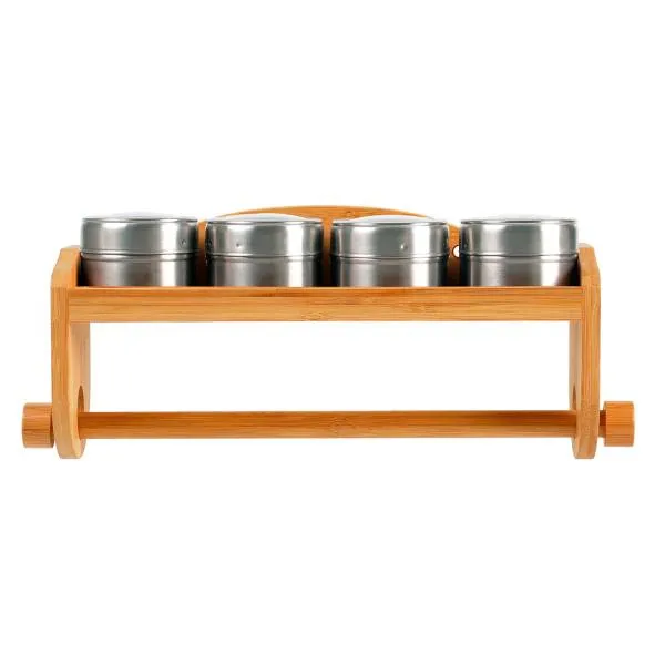 Porta Condimentos em Bambu/Aço Inox com acessórios. Acompanha base com furos para parede e suporte para rolo de papel toalha em Bambu; 4 porta condimentos em Aço Inox com tampa.