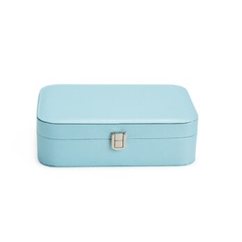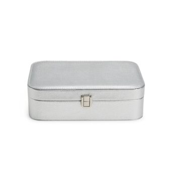 Porta-joias em poliuretano (PU) e revestimento interno aveludado. Apresenta, em seu interior, um espelho fixo e mais seis divisórias, incluindo uma repartição almofadada com ranhuras para guardar anéis. Além disso, o estojo possui trava de segurança para fechamento.