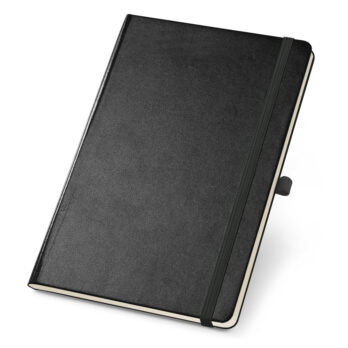 Caderno B6 de capa dura com 160 páginas lisas em cor marfim, suporte para esferográfica (não inclusa) e bolso interior. 120 x 180 mm