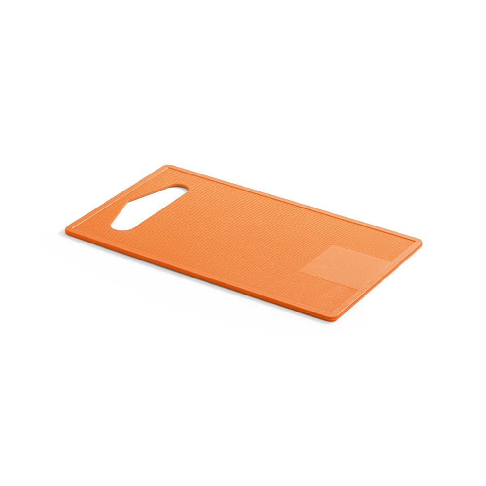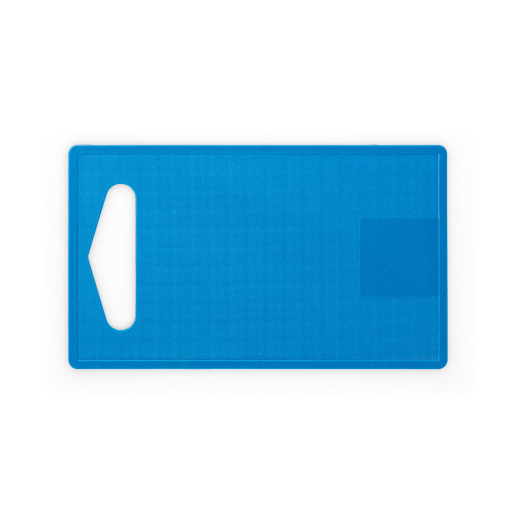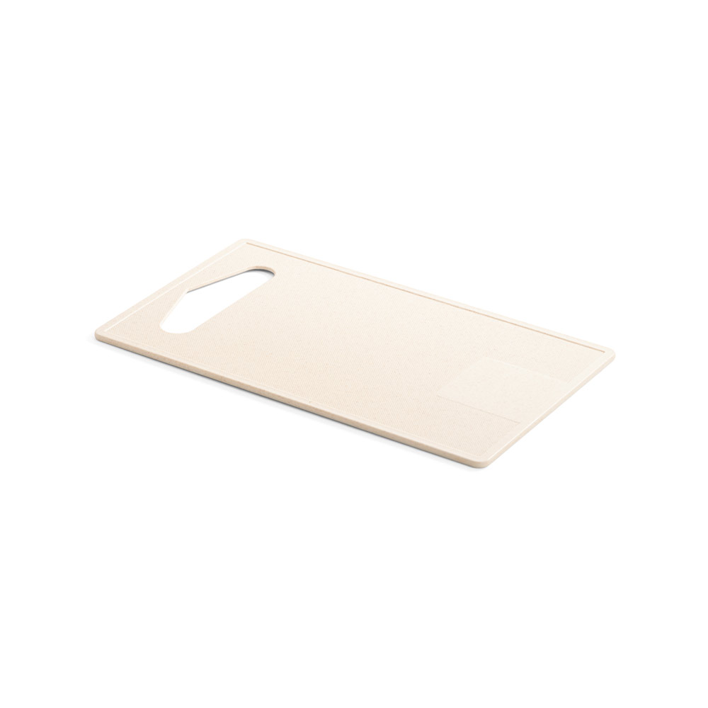 Tábua de corte em fibra de bambu (50%) e PP (50%). Contém um quadrado liso no fundo da tábua, adequado para a personalização. Certificação EU Food Grade. 237 x 140 x 4 mm